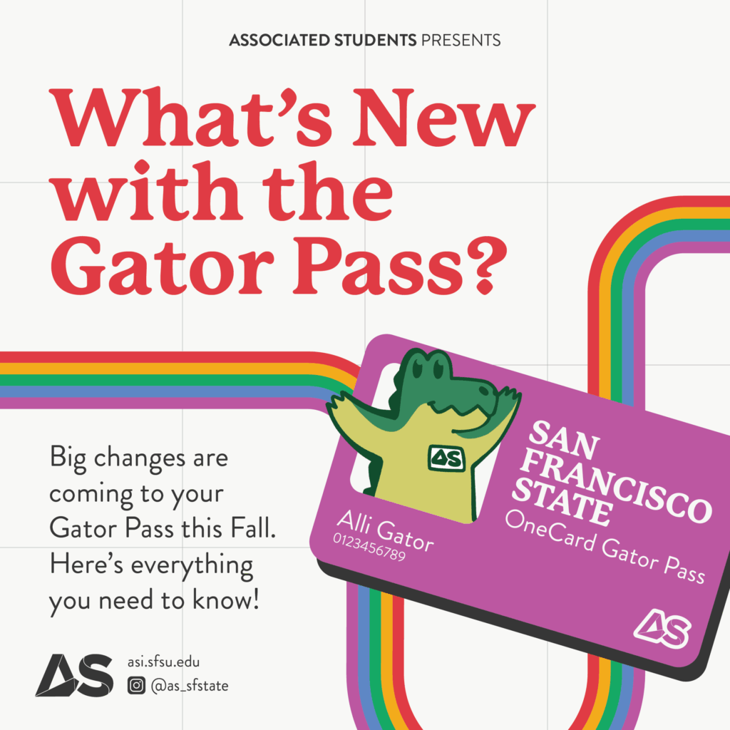 Did you know that you have access to not only MUNI and BART but also a plethora of other Bay Area transportation, including Caltrain, SF Bay Ferry, Golden Gate Transit, and VTA? This expansion was brought to you last year through the hard work of previous boards. Access to transit has been available through your student ID card in previous years, but you can now access your Gator Pass on the Clipper App!